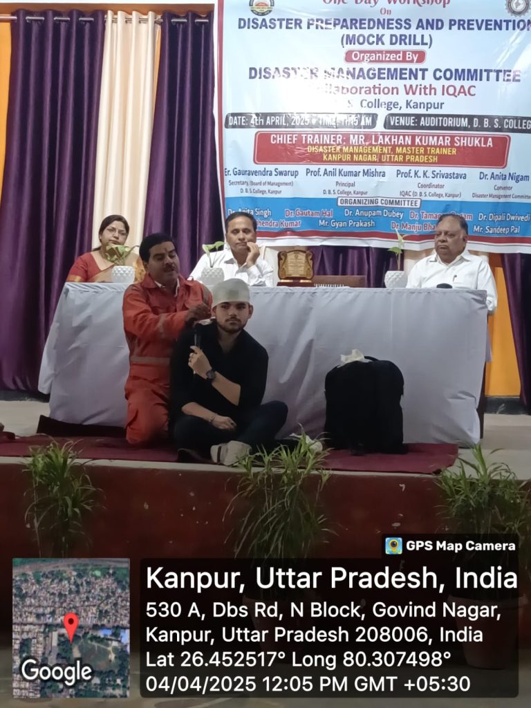 कानपुर, 4 अप्रैल 2025: डीबीएस कॉलेज कानपुर में आज आपदा की तैयारी और उसके रोकथाम के लिए मॉक ड्रिल आयोजित की गई। कार्यक्रम में ट्रेनर के रूप में श्री लखन कुमार शुक्ला, मुख्य प्रशिक्षक आपदा प्रबंधन रेड क्रॉस सोसायटी कानपुर नगर उत्तर प्रदेश उपस्थित रहे।
